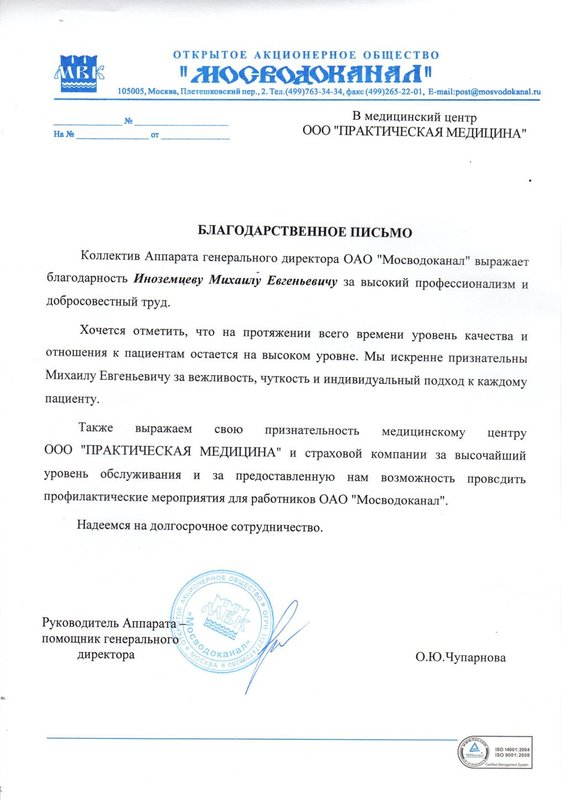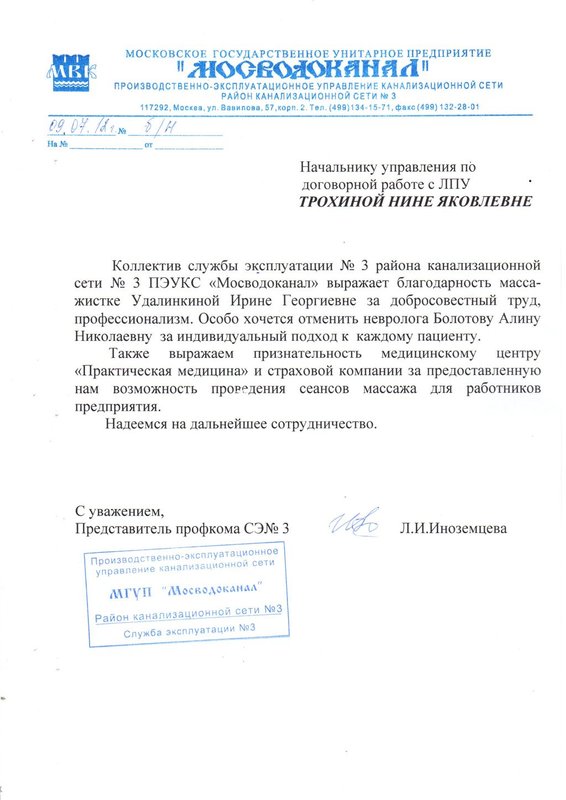 Хочу выразить свою благодарность врачам данного медицинского центра , а в особенности Иноземцеву Михаилу Евгеньевичу, Болотовой Алине Николаевне и самой доброй медсестре в мире - Ванюшиной Светлане Николаевне. Обратилась с болями в спине, после назначенного неврологом лечения сразу же почувствовала улучшение самочувствия , а после сеансов массажа спины боли полностью ушли. Спасибо Вам огромное!